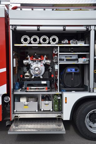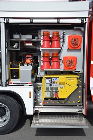 - Lichtmastbedienung sowie Motormanagement) und Tastensystem mit zusätzlichen Manometer/Vakuummeter (redundant) sowie integrierter Steuerung für Schaumzumischsystem Fire Dos 1600